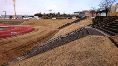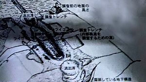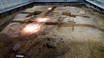 | (1)立命館大学でグラウンド下に保存されている製鉄遺跡(木瓜原遺跡) |