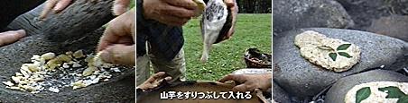 調理開始です。まずは、マテバシイの皮をむいてからすり石で細かくつぶしていきます。つなぎとして、山芋をすり下ろして