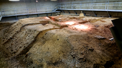 | (1)立命館大学でグラウンド下に保存されている製鉄遺跡(木瓜原遺跡) |