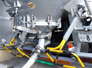 外国から輸入された小麦は,粉砕され小麦粉にされてから,専用の輸送車に充填されて国内の小麦粉を扱う事業所に輸送されます。目的地に着くと,ホースを受け入れ先の口金に繋ぎ,輸送車のタンク内を加圧し,送り先のホッパーまで高濃度(流動化)輸送します。タンクには小麦粉が約10ton充填されており,これを20〜30分で送りきります。