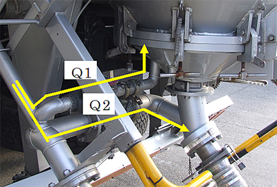 なお,タンクを45°に傾斜すると排出口はちょうど真下を向くようになっていて全量排出が可能なようになっています。また,流動化エアと輸送用エアは輸送元が共通で,それぞれの接続パイプに設けられたバルブの開度調整で流量比が変えられるようになっています。